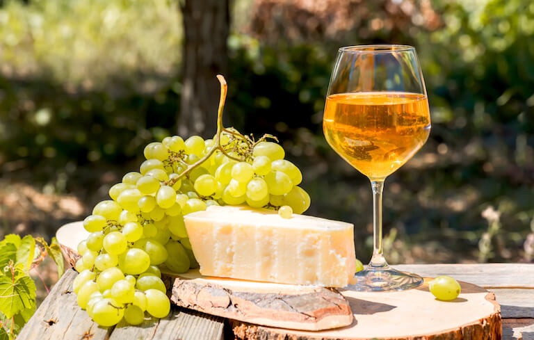 白ワインの原料である白ブドウ品種から造られますが、白ワインとは異なる製法方法です。オレンジワインは赤ワインと同じく、ブドウの果皮と種を含んだ果汁を発酵させるのが特徴。白ブドウの果皮の黄色系色素が果汁に移ることでオレンジ色になり、果皮に含まれるタンニンが溶け込んで赤ワインのような渋みのある風味が生まれます。