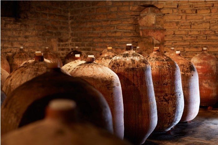『ジャー(アンフォラ)での熟成も開始。スペイン製の薄い素焼きの甕での熟成により、水分が少し蒸発し、若干凝縮する』